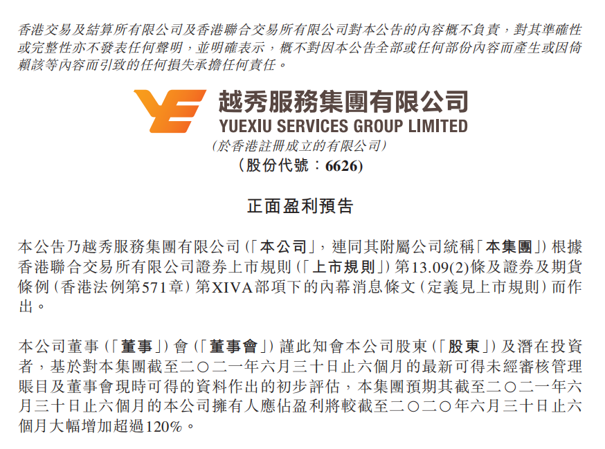 7月15日,开元ky服务集团有限公司(6626.HK)发布盈利预喜公告。公告称经过初步评估,集团预期截至2021年6月30日为止的六个月,公司拥有人应占盈利将同比大幅增加超过120%。